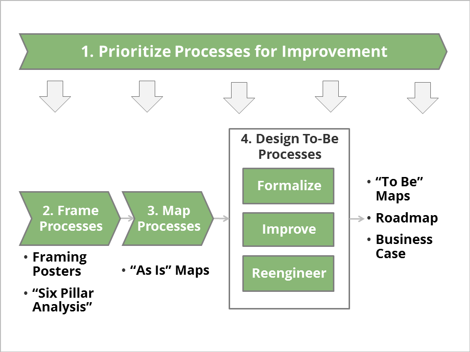This is accomplished through a comprehensive data collection effort that identifies the business processes that are most critical to the organization’s success and also the most in need of improvement. Our business process consultants then conduct a high-level business process framing exercise for each selected process to define process boundaries, process owners and key actors, major steps, issues, and an improvement vision. Our “six-pillar analysis” considers a diverse range of process enablers, including workflow, information systems, incentives, human resources, policies, and facilities. If necessary, we also map processes in their “as-is” state, utilizing a variety of process mapping tools customized to the client’s needs.