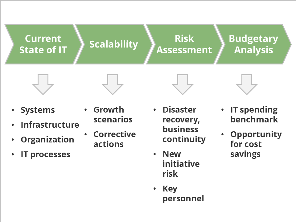 Our IT due diligence consulting service assesses the current state of an organization’s IT systems, IT infrastructure, people, and processes, identifies cost-cutting opportunities, risks, and future system scenarios. Our due diligence assessment of information technology encompasses the following areas:
